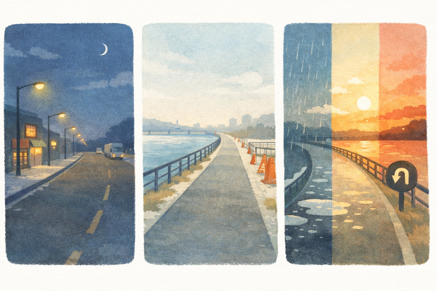 시작을 알리는 소리에 따라 천천히 발을 내딛는다. 고가 밑으로 내리막길을 따라가면 한강이 보인다. 강 따라 길이 끝없이 이어져 중간에 멈출 일이 없다. 공사중이라 임시로 설치한 구조물들이 중간중간 있지만, 그 정도는 상관없다